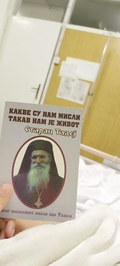 Prijem je protekao super. Ušla sam u sobu u koju ću provesti samo noć do carskog reza i kada sam ostala sama osećala sam se čudno. Kao pacijent nisam boravila nikad u bolnici, navikla sam da budem u uniformi. Šetala sam sobom koju naravno poznajem u centimetar, ali nisam znala šta ću sa sobom. Uzela sam samo najbitnije stvari koje će mi trebati za tu jednu noć, jer posle me prebacuju u intezivnu, pa posle u sobu za porodilje. Nema potrebe sve da raspakujem. Ponela sam i knjigu oca Tadeja iz Vitovnice „ Kakve su ti misli, takav ti je život“ da me malo umiri. 🙏🏼